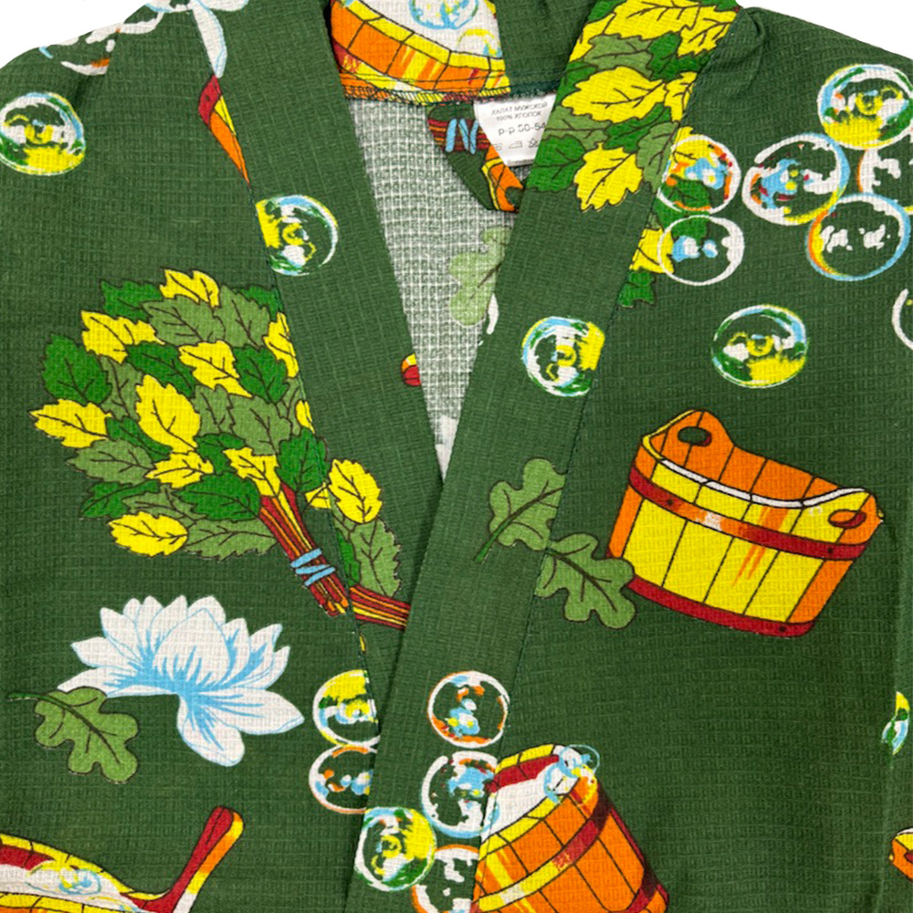 Легкий и удобный халат из вафельной ткани предназначен для отдыха после посещения парной. Свободный покрой с двумя карманами и поясом.