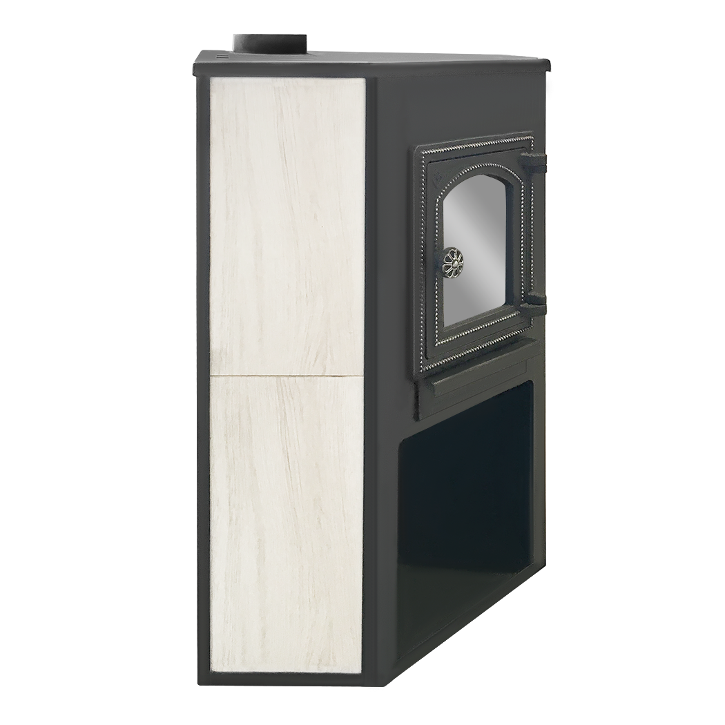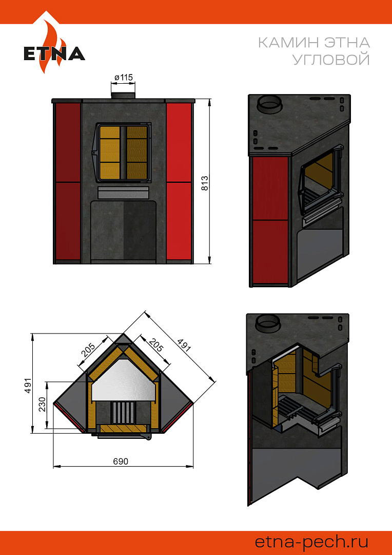 Печь-камин Этна изготовлена из высококачественной конструкционной стали , предназначена для отопления жилых и подсобных помещений до 150 м³. Конвекционно–вентилируемая облицовка, изготовленная из экологически чистой керамической плитки, обладающей большой теплоёмкостью, что позволяет в короткие сроки нагреваться и максимально долго удерживать стабильную температуру. Плитка хорошо поглощает влагу , а при пересушенном воздухе напротив ее отдает , что позволяет поддерживать комфортную атмосферу в помещении. Печь оснащена чугунной дверцей с жаростойким стеклом и чугунной колосниковой решеткой которая при нагревании не деформируется и обеспечивает отличный приток воздуха в топочную камеру.